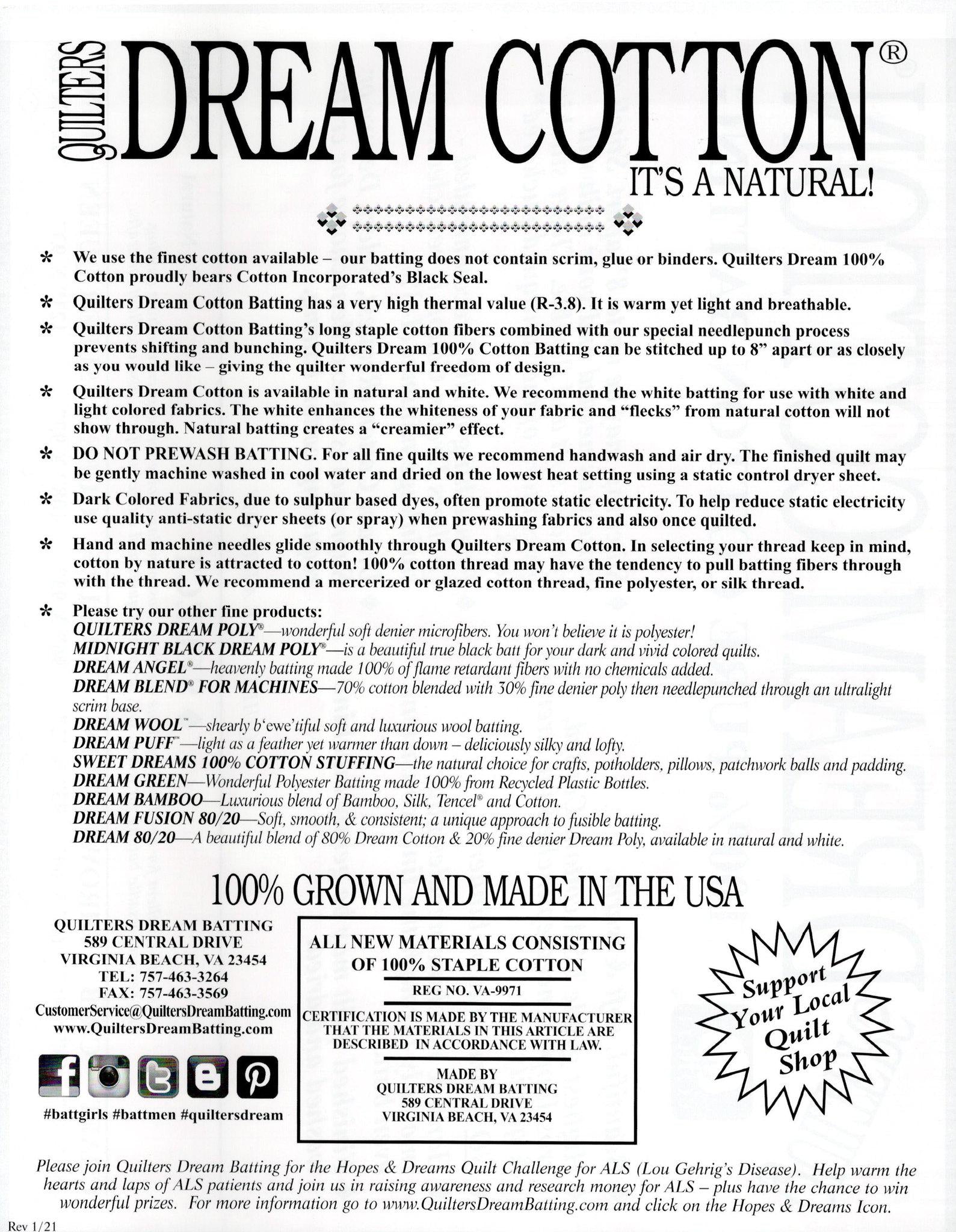 High quality 100% cotton batting unlike any other. 100% natural renewable cotton fiber, grown by U.S. farmers. There are no scrim, glue, resins or binders in Quilters Dream Cotton - nothing to resist your needle so it quilts like butter. Has a beautiful drape