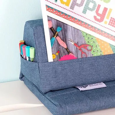 The Stitchy Stand does an outstanding job of holding all your stitching supplies! This pillow stand keeps your cross stitch pattern up and open while you stitch, while the extra pockets keep your scissors, needles and skeins nice and tidy The angle of the stand was set specially by Lori Holt for a perfect view.